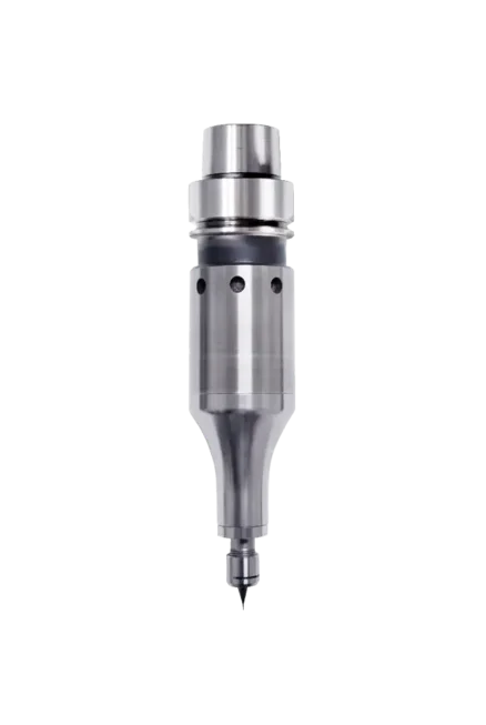 Operating at governed 40,000 RPM – 90,000 RPM, <0.2 HP (0.15 kW). The 601HSK-E40’s patented governor increases air flow volume to match cutting load maintaining rated high speed in cut. Get the required high SFM for small tools, 6-10x faster cycles and with 2 micron ultra precision to make the exact cuts you need. The constant high speed optimizes your tool performance, preventing breakages on micro tools and the 50 mm extended barrel allows for close workpiece operations or for work on machines with a short z-axis travel.